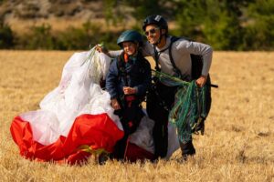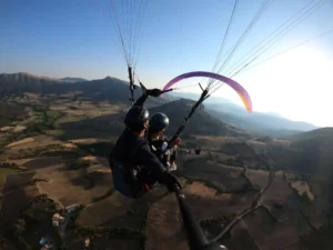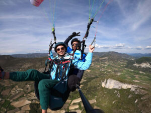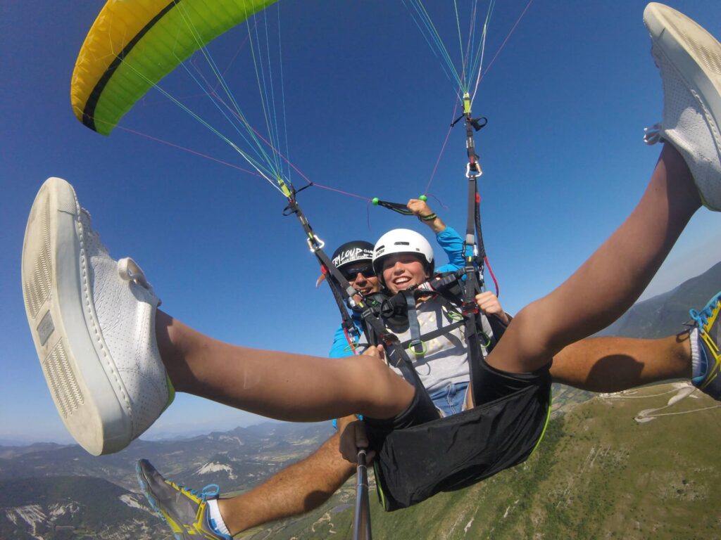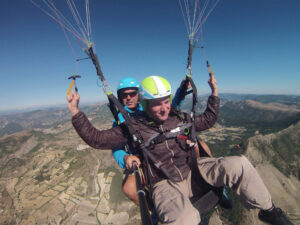 Équipement: nous vous conseillons de prévoir de bonnes chaussures (montantes si possible), un coupe vent et un pantalon. N’hésitez pas à prendre vos lunettes de soleil. Votre moniteur vous équipera d’un casque et d’une sellette de parapente.